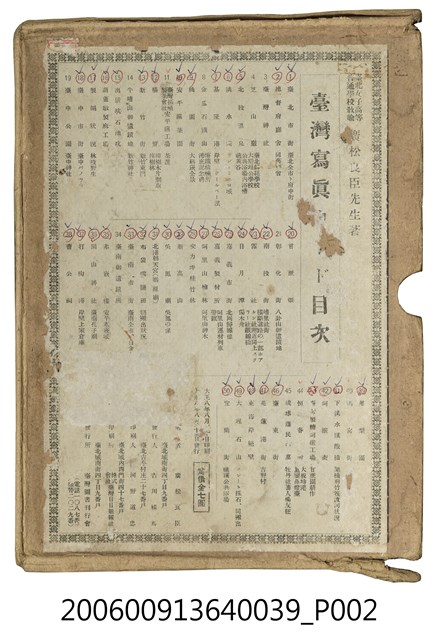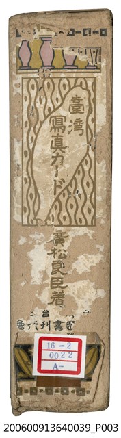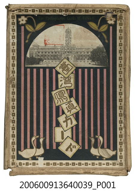 本物件為廣松良臣著《臺灣寫真卡》的封面紙盒,其正面為彩色圖案設計的封面圖,圖上有一個紅印,但印章字樣無法辨識。圖片上方是臺灣總督府的照片圖像,中央有「臺湾写真カード」字樣的大標題,總督府照片圖像下方有紫色長條圖樣設計,下方有四隻天鵝的圖樣設計,周圍並有幾何圖樣作為邊框裝飾;背面為「臺灣写真カード目次頁」面,著作者為廣松良辰,目次列出50個項次題名,大致上由臺灣北部開始逐次介紹臺灣各地的地方簡介、名勝古蹟、物產,如:第1項題名「臺北市街」、第2項題名「總督府廳舍」、第3項題名「臺灣神社」、第4項題名「芝山巌」、第5項題名「北投溫泉」…等。各項次的細部內容是以照片與文字說明呈現。左下方註明該寫真卡為大正8年發行,發行所為臺灣圖書刊行會。