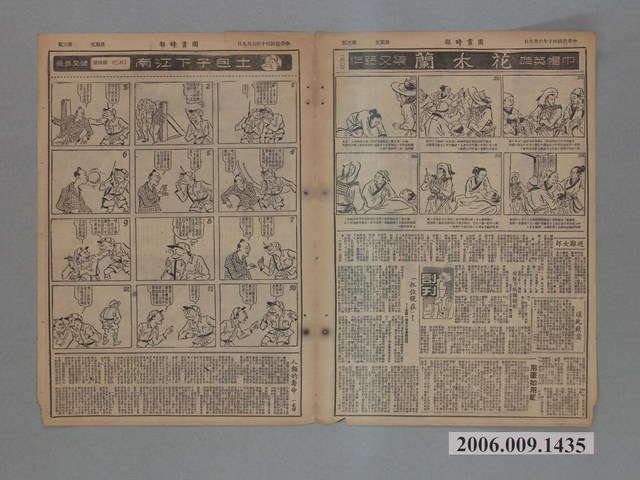 此物件為《中央日報》的姊妹報《圖畫時報》,為1949年底同《中央日報》來臺後一同創辦,由梁又銘所創辦,由於《中央日報》為中國國民黨的黨報,另外梁中銘與梁又銘在中國即是幫國民黨做文宣工作,所以報紙上的漫畫大多為「反共抗俄」的作品,以貶低毛澤東、史達林、中國共產黨的作品為主,另有連載作品如梁又銘的〈土包子下江南〉、牛哥李費蒙的〈牛伯伯打游擊〉、梁中銘的〈黃興傳〉等等。 臺灣漫畫發展主要始於1940年代日治末期,當時臺灣一群對漫畫有著興趣的青年聚集在一起且都參加過日本的漫畫函授學校,這些青年後自稱為「新高漫畫集團」,而其中最重要的成員為葉宏甲,他以「諸葛四郎」的創作者而成名,此為臺灣漫畫之濫觴,後這批「新高漫畫集團」的作者,在戰後於《新新》雜誌上發表漫畫。在二二八事件後《新新》雜誌被迫停刊,此時期的漫畫也由從中國來臺的移民主導,並以「反共抗俄」的政治宣傳漫畫為主,《中央日報》的漫畫專欄即是如此。在1950年代中後期到1960年代初,雖臺灣盜版漫畫極多,但漫畫的創作也是數量可觀,直到1966年正式實施《編印連環圖畫輔導辦法》,使臺灣漫畫受到大量審查,這樣的政策使日本盜版漫畫更加猖獗,並促使臺灣本土漫畫受到嚴重打擊,直到1990年代才逐漸復原。