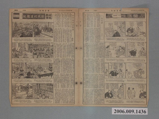 此物件為《中央日報》的姊妹報《圖畫時報》,為1949年底同《中央日報》來臺後一同創辦,由梁又銘所創辦,由於《中央日報》為中國國民黨的黨報,另外梁中銘與梁又銘在中國即是幫國民黨做文宣工作,所以報紙上的漫畫大多為「反共抗俄」的作品,以貶低毛澤東、史達林、中國共產黨的作品為主,另有連載作品如梁又銘的〈土包子下江南〉、牛哥李費蒙的〈牛伯伯打游擊〉、梁中銘的〈黃興傳〉等等。 臺灣漫畫發展主要始於1940年代日治末期,當時臺灣一群對漫畫有著興趣的青年聚集在一起且都參加過日本的漫畫函授學校,這些青年後自稱為「新高漫畫集團」,而其中最重要的成員為葉宏甲,他以「諸葛四郎」的創作者而成名,此為臺灣漫畫之濫觴,後這批「新高漫畫集團」的作者,在戰後於《新新》雜誌上發表漫畫。在二二八事件後《新新》雜誌被迫停刊,此時期的漫畫也由從中國來臺的移民主導,並以「反共抗俄」的政治宣傳漫畫為主,《中央日報》的漫畫專欄即是如此。在1950年代中後期到1960年代初,雖臺灣盜版漫畫極多,但漫畫的創作也是數量可觀,直到1966年正式實施《編印連環圖畫輔導辦法》,使臺灣漫畫受到大量審查,這樣的政策使日本盜版漫畫更加猖獗,並促使臺灣本土漫畫受到嚴重打擊,直到1990年代才逐漸復原。