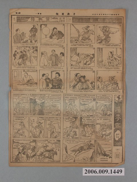 此物件為《中央日報》的專欄之一《漫畫半週刊》,為1950年承繼《中央日報》的姊妹報《漫畫時報》所開設的專欄,由梁又銘、梁中銘主編。由於《中央日報》為中國國民黨的黨報,另外梁中銘與梁又銘在中國即是幫國民黨做文宣工作,所以報紙上的漫畫大多為「反共抗俄」的作品,以貶低毛澤東、史達林、中國共產黨的作品為主,另有連載作品如梁又銘的〈土包子下江南〉、牛哥李費蒙的〈牛伯伯打游擊〉、梁中銘的〈黃興傳〉等等。 臺灣漫畫發展主要始於1940年代日治末期,當時臺灣一群對漫畫有著興趣的青年聚集在一起且都參加過日本的漫畫函授學校,這些青年後自稱為「新高漫畫集團」,而其中最重要的成員為葉宏甲,他以「諸葛四郎」的創作者而成名,此為臺灣漫畫之濫觴,後這批「新高漫畫集團」的作者,在戰後於《新新》雜誌上發表漫畫。在二二八事件後《新新》雜誌被迫停刊,此時期的漫畫也由從中國來臺的移民主導,並以「反共抗俄」的政治宣傳漫畫為主,《中央日報》的漫畫專欄即是如此。在1950年代中後期到1960年代初,雖臺灣盜版漫畫極多,但漫畫的創作也是數量可觀,直到1966年正式實施《編印連環圖畫輔導辦法》,使臺灣漫畫受到大量審查,這樣的政策使日本盜版漫畫更加猖獗,並促使臺灣本土漫畫受到嚴重打擊,直到1990年代才逐漸復原。