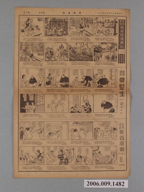 此物件為《中央日報》的專欄之一《漫畫半週刊》,為1950年承繼《中央日報》的姊妹報《漫畫時報》所開設的專欄,由梁又銘、梁中銘主編。由於《中央日報》為中國國民黨的黨報,另外梁中銘與梁又銘在中國即是幫國民黨做文宣工作,所以報紙上的漫畫大多為「反共抗俄」的作品,以貶低毛澤東、史達林、中國共產黨的作品為主,另有連載作品如梁又銘的〈土包子下江南〉、牛哥李費蒙的〈牛伯伯打游擊〉、梁中銘的〈黃興傳〉等等。 臺灣漫畫發展主要始於1940年代日治末期,當時臺灣一群對漫畫有著興趣的青年聚集在一起且都參加過日本的漫畫函授學校,這些青年後自稱為「新高漫畫集團」,而其中最重要的成員為葉宏甲,他以「諸葛四郎」的創作者而成名,此為臺灣漫畫之濫觴,後這批「新高漫畫集團」的作者,在戰後於《新新》雜誌上發表漫畫。在二二八事件後《新新》雜誌被迫停刊,此時期的漫畫也由從中國來臺的移民主導,並以「反共抗俄」的政治宣傳漫畫為主,《中央日報》的漫畫專欄即是如此。在1950年代中後期到1960年代初,雖臺灣盜版漫畫極多,但漫畫的創作也是數量可觀,直到1966年正式實施《編印連環圖畫輔導辦法》,使臺灣漫畫受到大量審查,這樣的政策使日本盜版漫畫更加猖獗,並促使臺灣本土漫畫受到嚴重打擊,直到1990年代才逐漸復原。