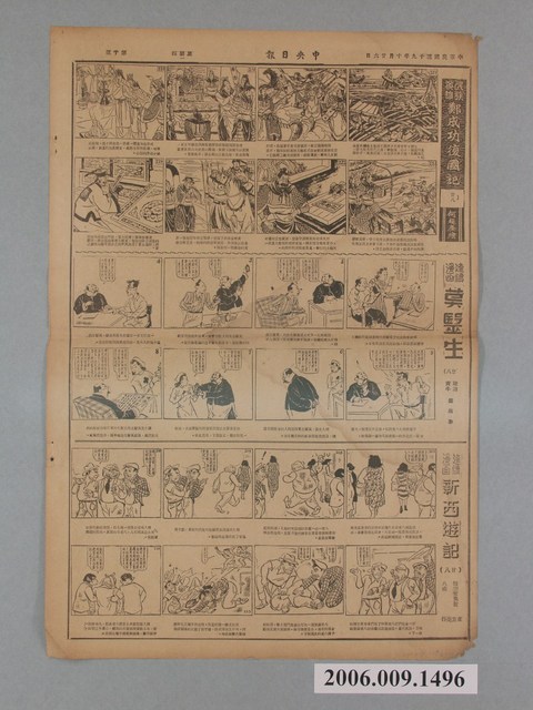 此物件為《中央日報》的專欄之一《漫畫半週刊》,為1950年承繼《中央日報》的姊妹報《漫畫時報》所開設的專欄,由梁又銘、梁中銘主編。由於《中央日報》為中國國民黨的黨報,另外梁中銘與梁又銘在中國即是幫國民黨做文宣工作,所以報紙上的漫畫大多為「反共抗俄」的作品,以貶低毛澤東、史達林、中國共產黨的作品為主,另有連載作品如梁又銘的〈土包子下江南〉、牛哥李費蒙的〈牛伯伯打游擊〉、梁中銘的〈黃興傳〉等等。 臺灣漫畫發展主要始於1940年代日治末期,當時臺灣一群對漫畫有著興趣的青年聚集在一起且都參加過日本的漫畫函授學校,這些青年後自稱為「新高漫畫集團」,而其中最重要的成員為葉宏甲,他以「諸葛四郎」的創作者而成名,此為臺灣漫畫之濫觴,後這批「新高漫畫集團」的作者,在戰後於《新新》雜誌上發表漫畫。在二二八事件後《新新》雜誌被迫停刊,此時期的漫畫也由從中國來臺的移民主導,並以「反共抗俄」的政治宣傳漫畫為主,《中央日報》的漫畫專欄即是如此。在1950年代中後期到1960年代初,雖臺灣盜版漫畫極多,但漫畫的創作也是數量可觀,直到1966年正式實施《編印連環圖畫輔導辦法》,使臺灣漫畫受到大量審查,這樣的政策使日本盜版漫畫更加猖獗,並促使臺灣本土漫畫受到嚴重打擊,直到1990年代才逐漸復原。
