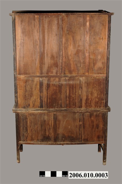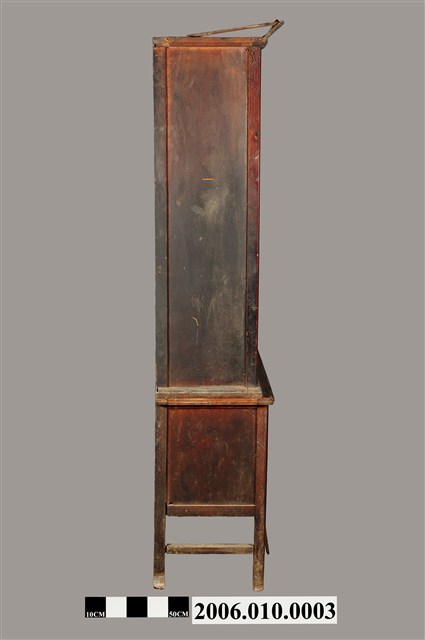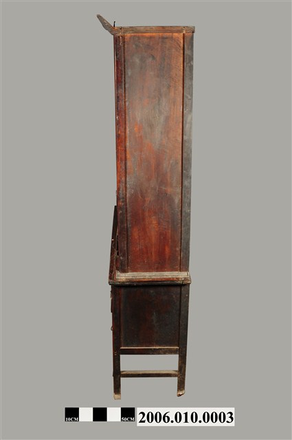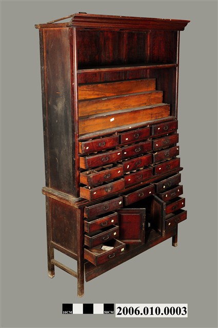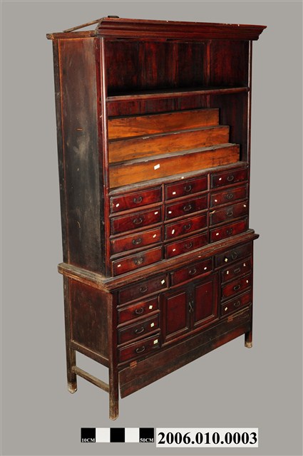 本物件為藥櫃。木製藥櫃空間分成三部分,上兩層為半開放式的空間,無門,最上層是一沒有分隔的空間,下一層有3層階梯,可分層擺放物品。下方有21個櫃子,有可拉的鐵環,抽屜分布分成兩種設計,上方有12個抽屜,下方有9個抽屜,9個抽屜中間有兩扇對開的櫃門,打開後有空間置放物品。藥櫃底部有4腳,將藥櫃撐離地面。