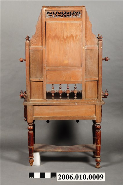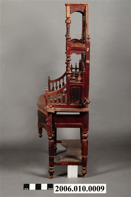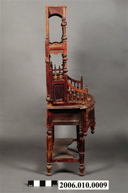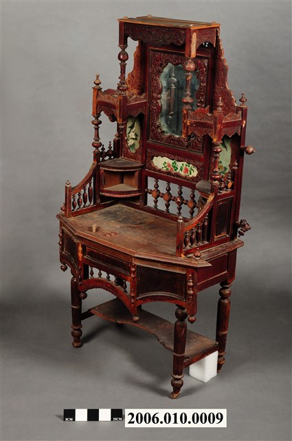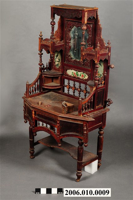 1. 本件為洋風的梳妝臺,頂端似有破損缺件,頂部做兩車枳柱屋頂狀,三邊有牙子,皆做淺浮雕蓮花紋,背面則有鏤空花草紋。兩柱連接至側面小檯面,小檯面可分為三層,中層內面鑲嵌有花鳥玻璃畫,周邊多施有淺浮雕花草紋。中間鑲有略似團扇形的鏡面,周邊同樣施以淺浮雕洋風花草紋,其下方鑲嵌有牡丹花玻璃畫,最下層則為車枳欄杆。桌面與前方裙板皆以車枳柱、欄杆構成,但板面並不做裝飾。最下方則為四支車枳柱,前後兩足間皆有棖,棖間則有置腳層板。2. 車枳(車床加工)是日治時期引入之工法,洋風家具亦常見於日治時期。