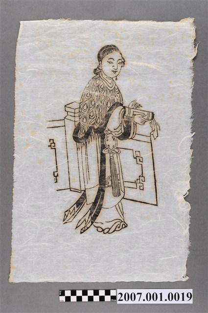 侍女為女性神祇之侍者,一般多為兩人一對以作為女神之挾祀,其造形多作古代丫鬟模樣,雙手持扇或其他寶物,作服侍主神姿態。依版印風格,推測本件與登錄號2007.001.0020應為一對。