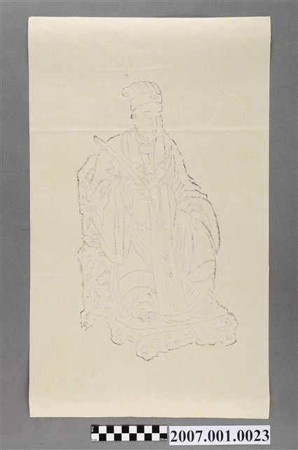 本件司命灶君版印神像,以單一墨色印製於黃色紙張上,其印版為清代製品。畫面單獨作一尊司命灶君坐像,神端坐於木椅之上,面朝左方,白白無髯,頭精忠冠,身穿寬袖官袍,左手平舉持一方朝笏板,右手置於右膝之上。