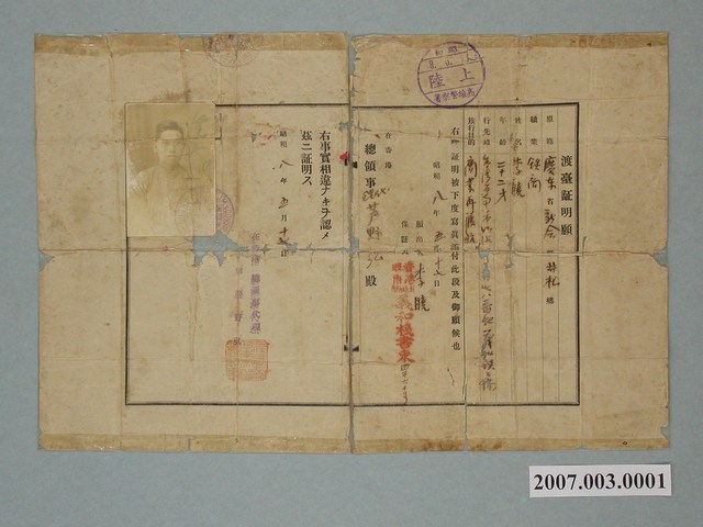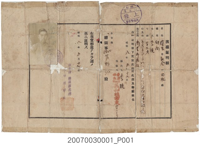 2007.003.0001 李曉昭和8年渡臺證明書