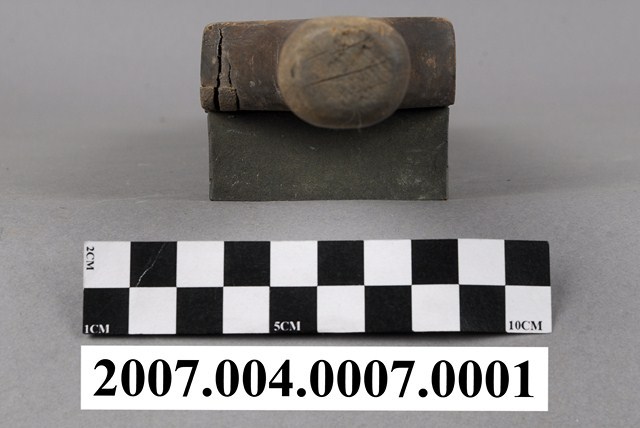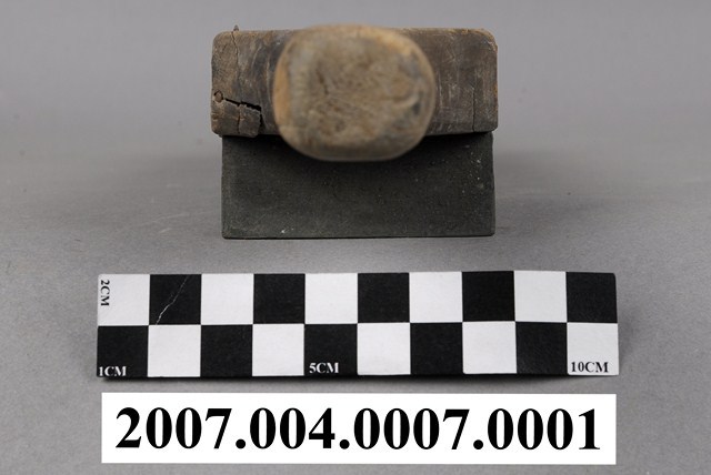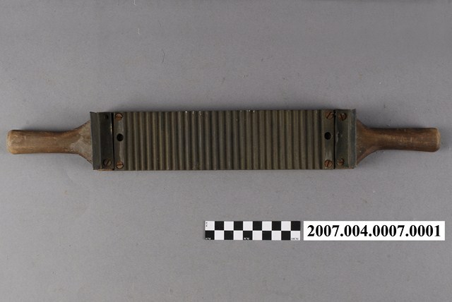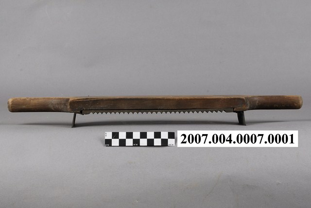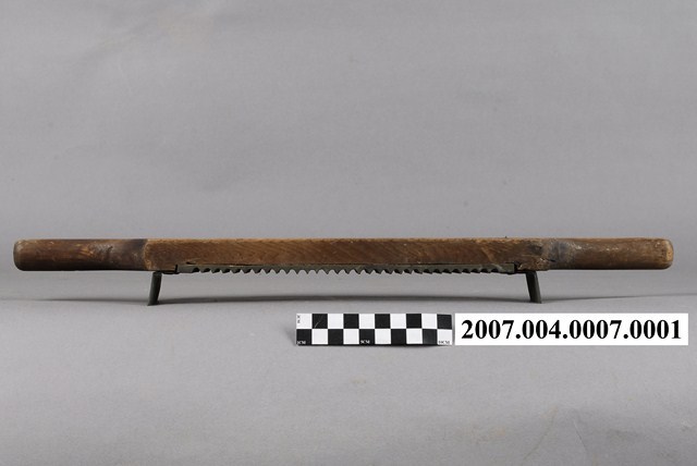 本物件為手工製丸器手持處。手持處分成兩部分,木頭材質與金屬材質部分。木頭材質處兩端較細,可握。木頭材質處中間較寬,其上釘有金屬片,金屬片上有一條條溝槽。