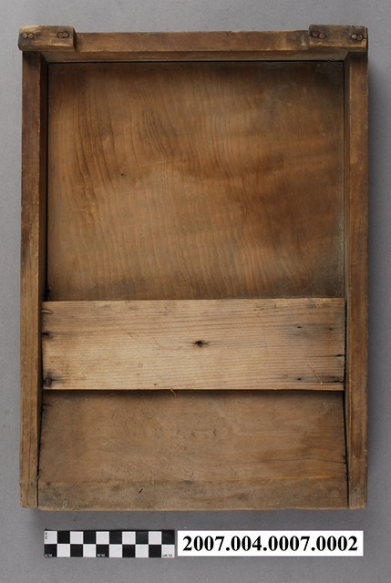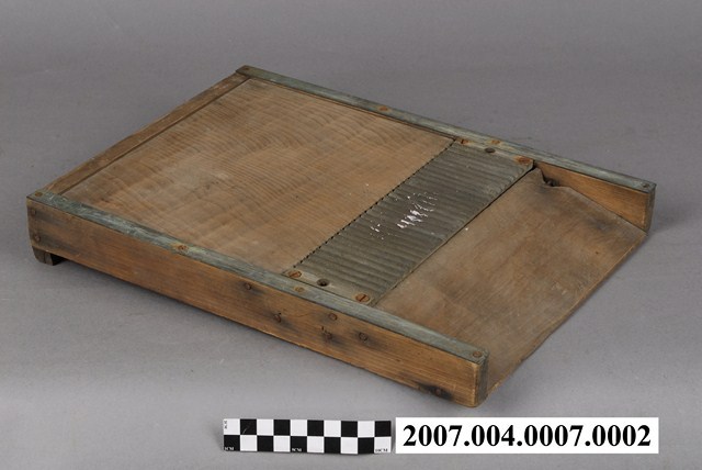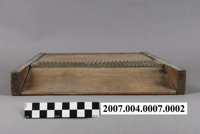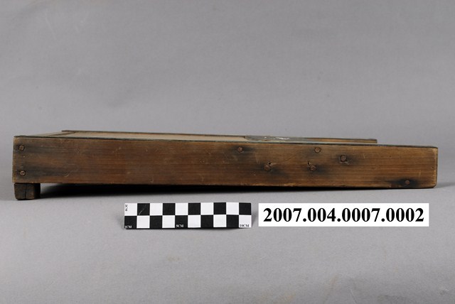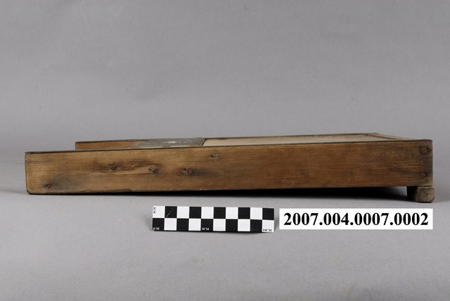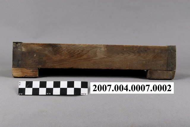 本物件為手工製丸器底座。底座為長方型,分成兩部分,木頭材質與金屬材質部分。木頭材質處是由平面與斜面組成,平面與斜面交接處釘有金屬片,金屬片上有一條條溝槽。底座一邊釘有木條,讓整體有傾斜角度。