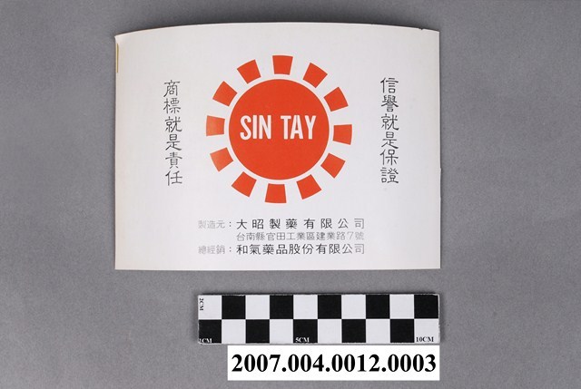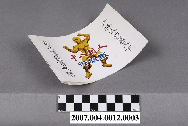 1. 本物件為大昭製藥有限公司製造十八銅人行氣散說明書。說明書外觀正面印有銅人圖案,以及少林武功蓋天下、出名傳統傷嗽藥和十八銅人行氣散字樣。背面則印有商標,以及製造商與經銷商資訊。 2. 產品包裝紙盒樣印有製造日期840426字樣,可能為民國84年(1995)或西元1984年,其製藥公司地址標示為中華民國臺灣省,依此地址標示,製造年份為民國84年)的可能性較大。