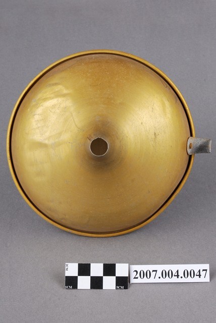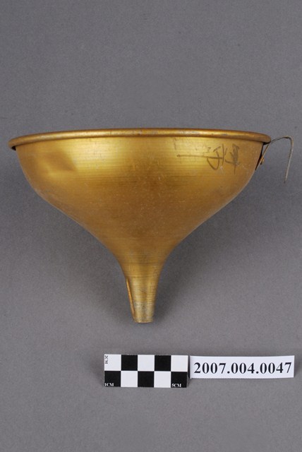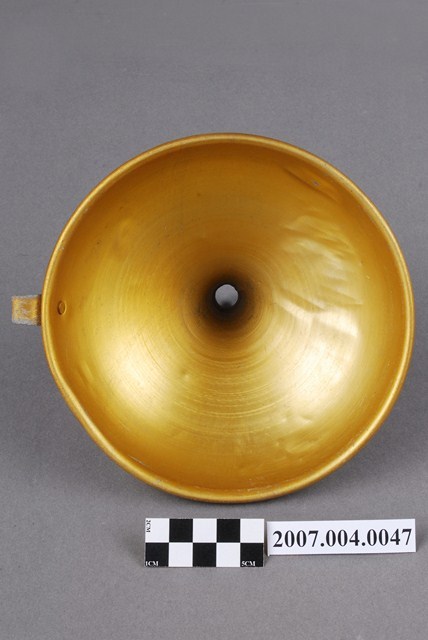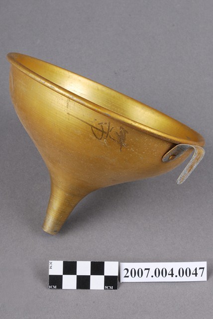 本物件為鋁製漏斗。漏斗為黃銅色,漏斗口略有變型。漏斗身有一握把。
