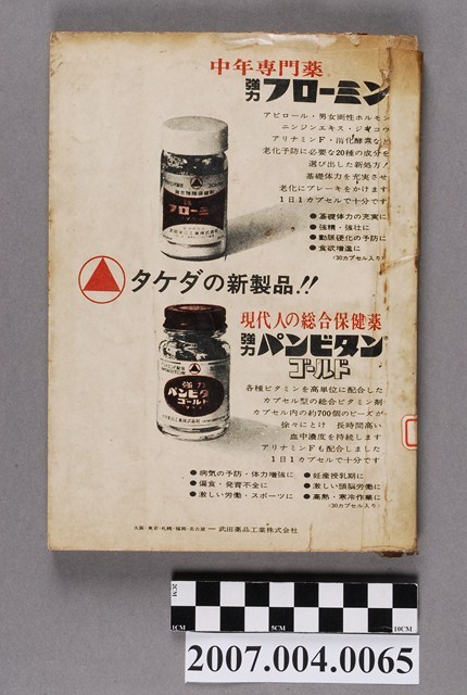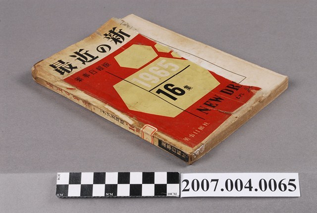 1.本物件為藥事日報社編《最近の新藥》第16集,封面上方標題為「最近の新薬」,其下則為「薬事日報版」字樣,中間圖樣為「1965」及「16集」圖示,右下方有「NEW DRUGS in Japan」字樣,左下角有「薬事日報社」字樣。內頁有藥事日報社編寫的前言「まえがき」,後接3頁的目錄。內文報導之前為介紹「昭和39年度における医薬品の承認許可の概観」專文,其下另有「医薬品の一般名称について」、「U. S.Adopted Names」二篇專文。內文依序介紹「抗生物質」、「サルファ剤」、「ナリジキシン製剤」等內容。本書於昭和40年4月5日由位於東京的藥事日報社發行。