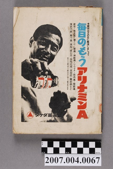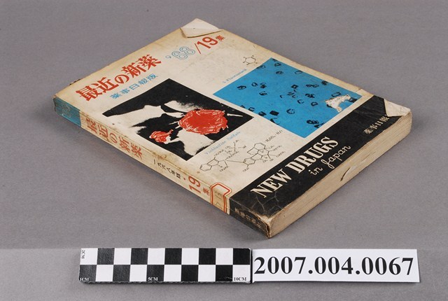 1.本物件為藥事日報社編《最近の新藥》第19集,封面上方左側標題為「最近の新薬」,其下則為「薬事日報版」字樣,右上角為「68」、「19集」字樣,中間圖樣為「硫酸長春鹼」與「氟尿嘧啶」的照片及化學分子式圖示,左下方有「NEW DRUGS in Japan」字樣,右下角有「薬事日報社」字樣。內頁有藥事日報社編寫的前言「まえがき」,後接4頁的目錄。內文報導之前為厚生省藥物局製藥課所撰「昭和42年度における医薬品の承認許可の概観」專文,其下另有厚生省藥物局製藥課長渡边康所撰「医薬品製造承認に関する基本方針について」、「U. S.Adopted Names(1967年度)」二篇專文。內文依序介紹「抗腫瘍剤」、「抗生物質」、「サルファ剤」等內容。本書於昭和43年4月5日由位於東京的藥事日報社發行。