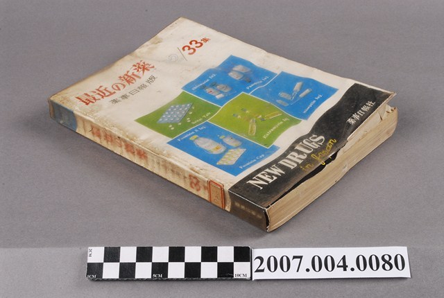 1.本物件為藥事日報社編《最近の新藥》第33集,封面上方左側標題為「最近の新薬」,其下則為「薬事日報版」字樣。右上角為「82」、「33集」字樣,中間圖樣為「各樣式的藥錠、藥劑」照片圖示,左下方有「NEW DRUGS in Japan」字樣,右下角有「薬事日報社」字樣。內頁有藥事日報社所撰寫的前言「まえがき」,後接4頁的目錄,內文報導之前為「昭和56年度における医薬品の承認許可の概観」專文,其下另有「医薬品の安全對策」、「医薬品再評価結果」、「医薬品の一般名称について」三篇專文。內文依序介紹「抗腫瘍剤」、「抗生物質」、「化學療法剤」等內容。本書於昭和57年4月2日由位於東京的藥事日報社發行。