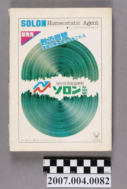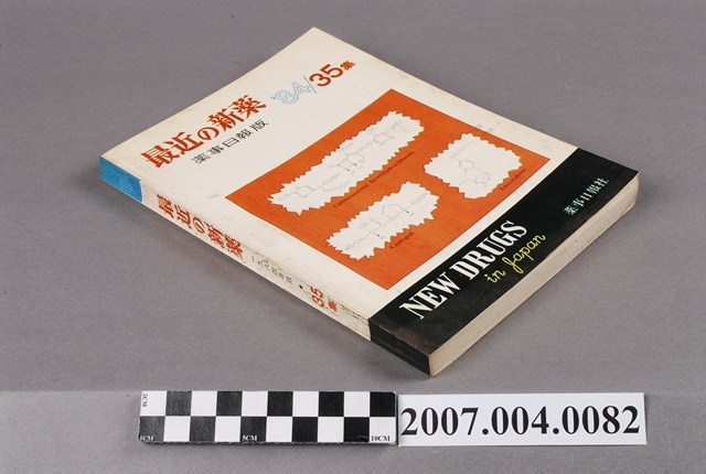 1.本物件為藥事日報社編《最近の新藥》第35集,封面上方左側標題為「最近の新薬」,其下則為「薬事日報版」字樣。右上角為「84」、「35集」字樣,中間圖樣為Celmenoxime hemihydrochloride;Captopril;Enocitabine三種藥劑的化學分子式圖示,左下方有「NEW DRUGS in Japan」字樣,右下角有「薬事日報社」字樣。內頁有藥事日報社所撰寫的前言「まえがき」,後接3頁的目錄,內文報導之前為「昭和58年度における医薬品の承認許可の概観」專文,其下另有「医薬品の安全對策」、「医薬品再評価結果」、「医薬品の一般名称について」、「新開發医薬品副作用まとめ」及「"最近の新薬"10年の步み」五篇專文。內文依序介紹「抗腫瘍剤」、「抗生物質」、「化學療法剤」等內容。本書於昭和59年3月28日由位於東京的藥事日報社發行。