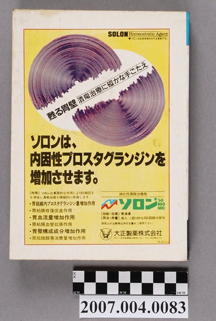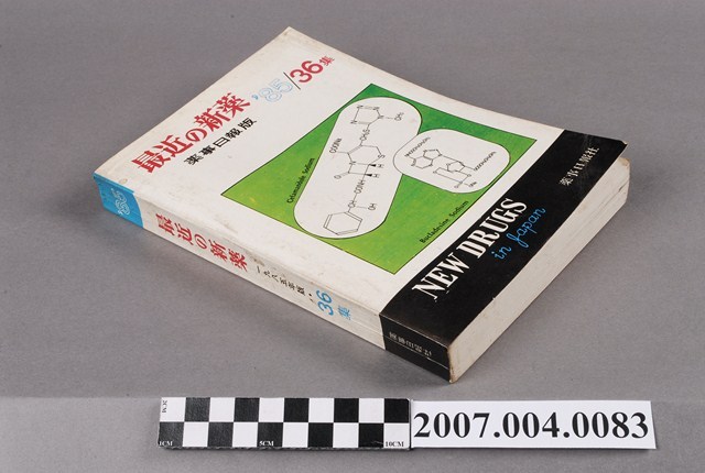 1.本物件為藥事日報社編《最近の新藥》第36集,封面上方左側標題為「最近の新薬」,其下則為「薬事日報版」字樣。右上角為「85」、「36集」字樣,中間圖樣為Cefamandole Sodium;Bucladesine Sodium二種藥劑的化學分子式圖示,左下方有「NEW DRUGS in Japan」字樣,右下角有「薬事日報社」字樣。內頁有藥事日報社所撰寫的前言「まえがき」,後接4頁的目錄,內文報導之前為「昭和59年における審查行政」專文,其下另有「医薬品の安全對策」、「医薬品再評価結果」、「医薬品の一般名称について」三篇專文。內文依序介紹「抗惡性腫瘍剤」、「抗生物質」、「化學療法剤」等內容。本書於昭和60年4月2日由位於東京的藥事日報社發行。