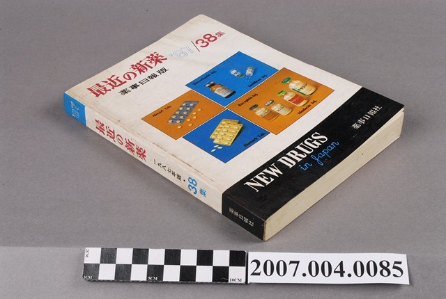 1.本物件為藥事日報社編《最近の新藥》第38集,封面上方左側標題為「最近の新薬」,其下則為「薬事日報版」字樣。右上角為「87」、「38集」字樣,中間圖樣為「各種藥劑、藥錠」的照片圖示,左下方有「NEW DRUGS in Japan」字樣,右下角有「薬事日報社」字樣。內頁有藥事日報社所撰寫的前言「まえがき」,後接3頁的目錄,內文報導之前為「昭和61年における審查行政」專文,其下另有「医薬品の安全對策」、「医薬の再審查」、「医薬品再評価結果」、「医薬品の一般名称」四篇專文。內文依序介紹「抗惡性腫瘍剤」、「抗生物質」、「化學療法剤」等內容。本書於昭和62年4月2日由位於東京的藥事日報社發行。