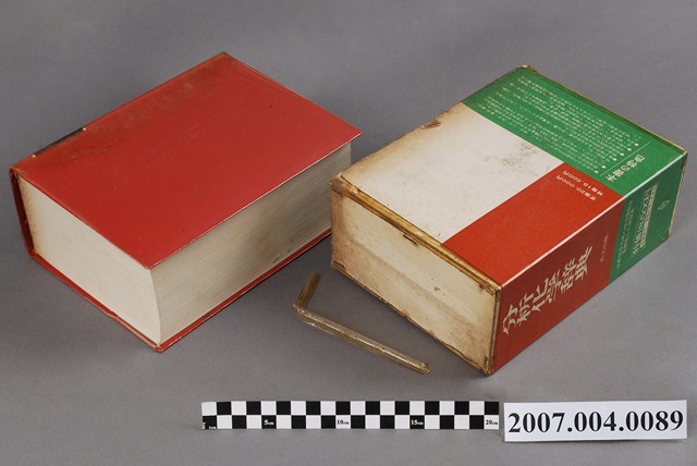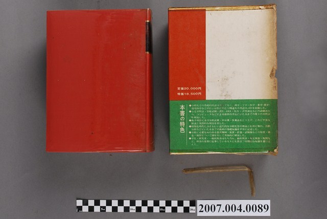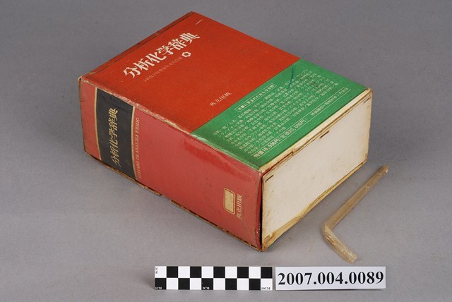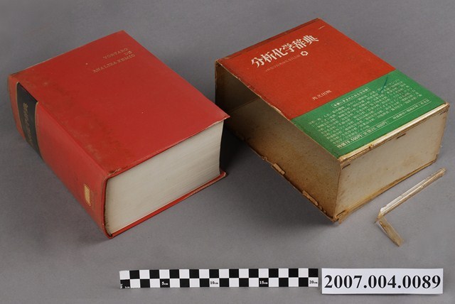 本物件為分析化學辭典,分為書殼與本體二物。書殼以紅綠為底,正面可見「分析化學辭典」、「分析化學辭典編輯委員會編」字樣,背面可見本書售價以及特色介紹;書本體為全紅色,正面可見「VORTARO DE ANALIZA KEMIO」字樣,側面可見「分析化學辭典」字樣。