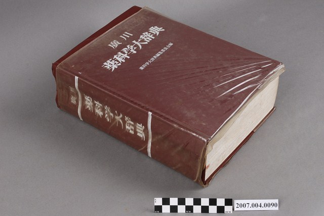 本物件為藥科學大辭典編輯委員會編《廣川藥科學大辭典》。書皮為紅色硬殼,外層有塑膠書套。封面印有廣川藥科學大辭典、藥科學大辭典編輯委員會編字樣,無圖。除了序、編輯委員名冊、參考文獻等以外,主要目錄以五十音為命名方式,共有10項,分別為ア行、カ行、サ行、タ行、ナ行、ハ行、マ行、ヤ行、ラ行、ワ行,後有抗生物質構造式表和處方用語兩附錄。本書由廣川出版社,於西元1983年出版。