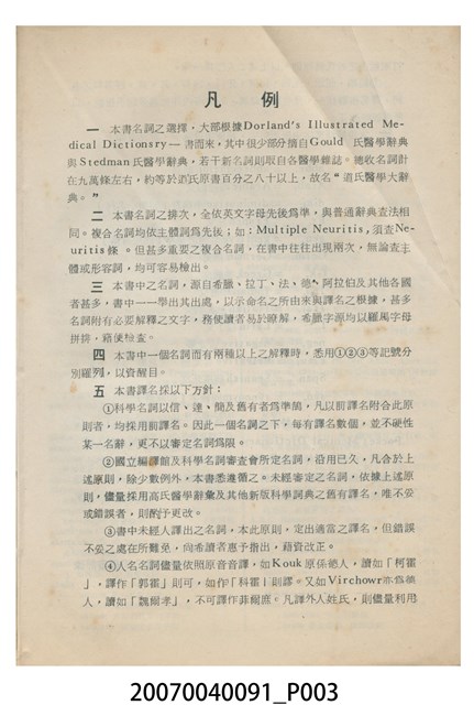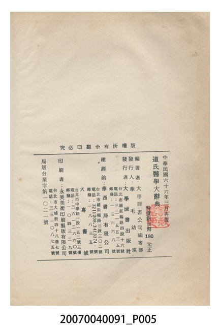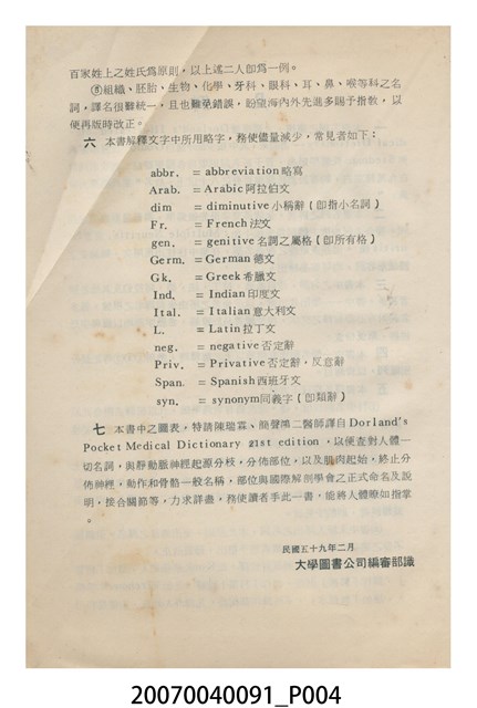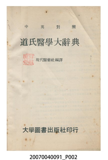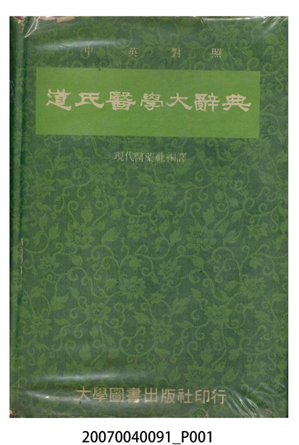本物件為道氏醫學大辭典,為綠色書皮。由物件正面可見「道氏醫學大辭典」、「中英對照」、「現代醫藥社編譯」字樣。該刊物內頁亦可見刊物發行人為華毛幼琪,發行所為大學圖書出版社(地址為臺北市羅斯福路四段十六號)。內容依照A至Z開頭排序,對於各個醫學用詞做出解釋。