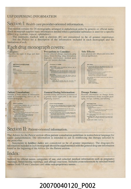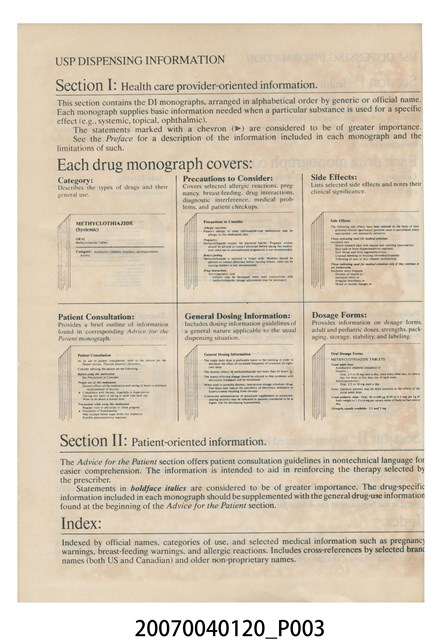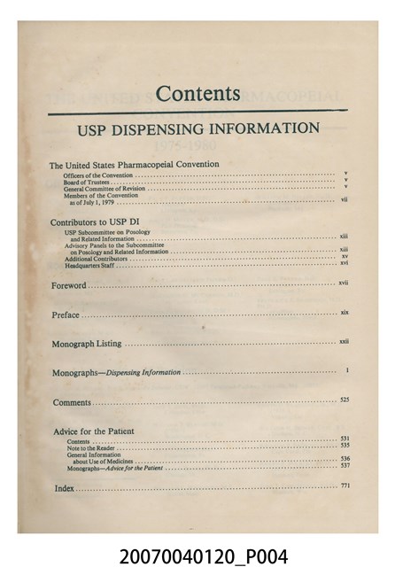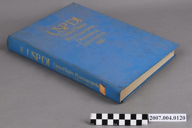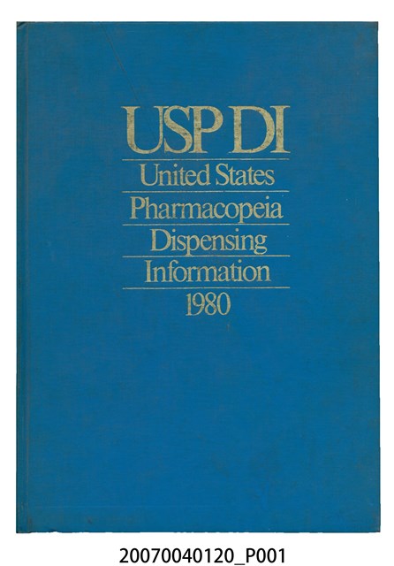 本物件為USP DI》1980年版,為藍色書皮。由物件正面可見「USP DI」、「United States」、「Pharmacopeia」、「Dispensing Information」、「1980」字樣。其目錄章節可見包括「The United States Pharmacopeial Convention」(如:Officers of the Convention)、「Foreword」、「Preface」。