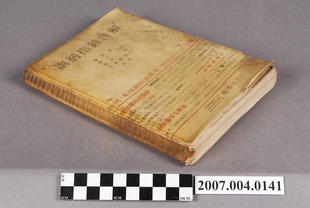 本物件為櫻井喜一等著《調劑指針注解》。外封已泛黃,物件正面上方寫有印有書名「調劑指針注解」與作者姓名,下方對本書做簡介,底部有出版社「藥事日報社」字樣。目次分有序論、總論、各論三大章;序論有「醫藥品」、「度量衡」、「醫藥品の適用の方法」、「藥物の連用による影響」、「藥局」五章。總論針對處方籤介紹;各論依藥劑種類有「散劑」、「丸劑」、「液劑」、「外用劑」、「軟膏劑」、「坐劑」...等等,每章針對種類並結合大量圖片與表格附錄來做註解介紹。