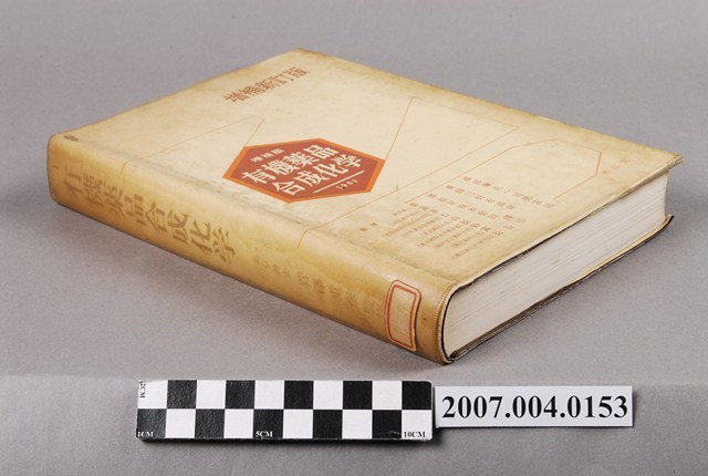 本物件為赤星三彌等著《有機藥品合成化學》增補新訂版。外封已泛黃,封面印有「增補版 」、「有機藥品合成化學」、 「1963」;上方則為「增補新訂版」;下方印有監修者之頭銜與姓名、「南江堂」字樣。書背印有「有機藥品合成化學」、「藥學博士 菅澤重彥 監修」。封底有橘紅底之「N」字圖示,售價¥1300。本書為昭和40年4月1日增補第7版發行,目次部分可見其章節包含酸化(Oxidation)、還元(Reduction)、ニトロ (Nitration)、スルホン化(Sulfonation)等等。
