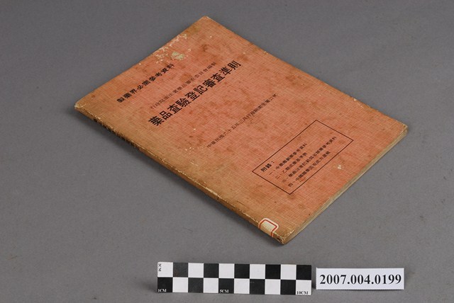 本物件為行政院衛生署藥品審查委員會編製《藥品查驗登記審查準則》。書皮為橘色。封面印有製藥界必需參考資料、行政院衛生署藥品審查委員會編製、藥品查驗登記審查準則、中華民國六十五年三月行政院衛生署公佈等字樣以及附錄。目錄共有28個標題,無章節之分,附錄有4個標題。最後一頁有說明此為楊澄隆整理彙印成單行本,日期為西元1976年3月31日。
