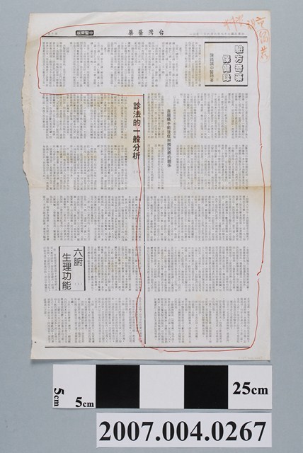 本物件為《台灣醫藥》民國77年6月6日中醫藥版。印刷方式為直書。中醫藥版為第9版,頭條為中藥商輔導管理方案惹出風暴,另有其他新聞與醫藥訊息。背面為第10版中醫藥版,頭條為驗方奇藥保健錄,由陳鐵誠中醫師著,另有其他醫療資訊。