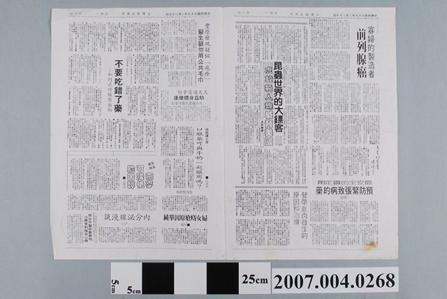 1. 本物件為台灣衛生新聞社發行《台灣衛生新聞》民國77年2月29日第1866期。此物件共有4版,第1版有刊物標頭台灣衛生新聞以及發行訂閱資訊。第1版頭條為死亡率僅千分之五點二 我列世界死亡率最低國家,另外還有其他新聞。第2版頭條為寡婦的製造者前列腺癌,另有其他資訊,例有昆蟲世界的大鏢客 虎蚊殺人蜂威脅美國。第3版頭條為豐原發現疑似疱疹 醫師籲勿用公共毛巾,另有其他資訊。第4版頭條為陰部搔癢,另有其他健康衛生資訊,亦有翻譯短文。