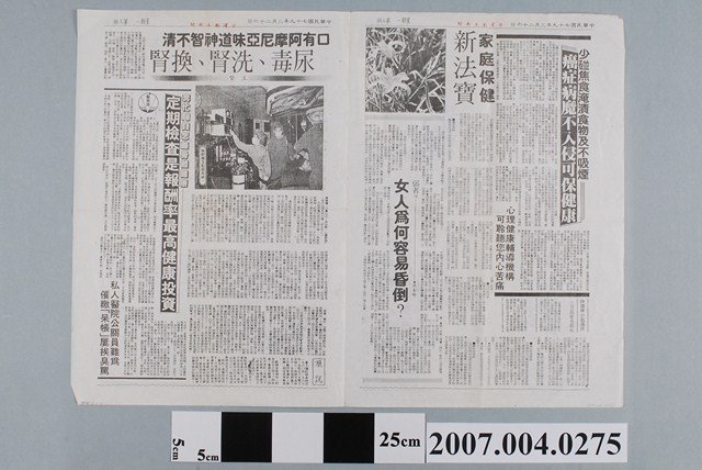 1. 本物件為台灣衛生新聞社發行《台灣衛生新聞》民國79年3月26日第1965期。此物件共有4版,第1版有刊物標頭台灣衛生新聞以及發行訂閱資訊。第1版頭條為隨工業成長呈現多樣化職業性病變勿掉輕心,另外還有其他新聞。第2版頭條為少碰焦食醃漬食物及不吸煙 癌症病魔不入侵可保健康,另有其他資訊。第3版頭條為口有阿摩尼亞味道神智不清 尿毒、洗腎、換腎,另有其他資訊,例如私人醫院公關員難為 催繳呆帳屢挨臭罵。第4版頭條為不是昂貴就好 幾種有益健康的食品,另有其他醫療資訊。