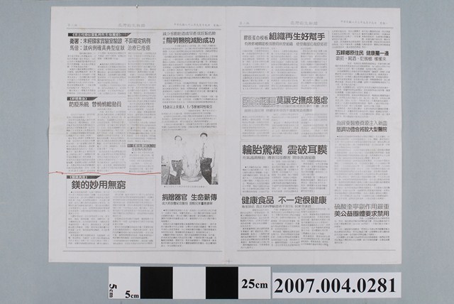 1. 本物件為台灣衛生新聞社發行《台灣衛生新聞》民國83年9月19日第2169期。此物件共有4版,第1版有刊物標頭台灣衛生新聞以及發行訂閱資訊。第1版頭條為熱線追蹤-本土性疑似霍亂病例 衛署消音 學者評價各異,另外還有其他新聞。第2版頭條為膠原蛋白模版 組織再生好幫手,另有其他健康資訊。第3版頭條為本土性疑似霍亂病例 引發震撼,另有其他醫療資訊。第4版頭條為市售保險套 會漏水,另有其他醫療資訊和新知等,例如它的名字就叫保險套 拜知名度之賜 乾脆成立博物館,介紹法國保險套博物館。