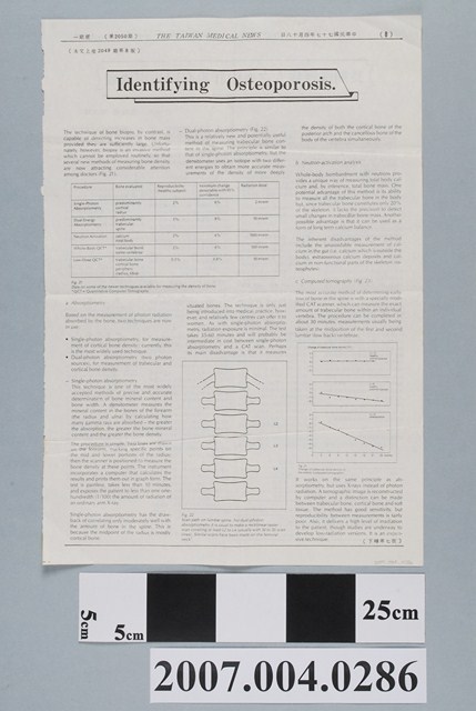 本物件為《The Taiwan Medical News》民國77年4月18日第2050期7至8版。第1版文章為長期洗腎病人之血中肝炎有關病毒標幟,由曾炳文、吳榮曙、陳洸鐘提供。第8版為全英文文章,標題為Identifying Osteoporosis。
