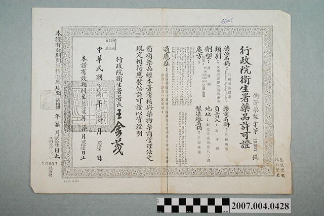 2007.004.0428 三和藥廠三和滅感糖漿行政院衛生署藥品許可證影本