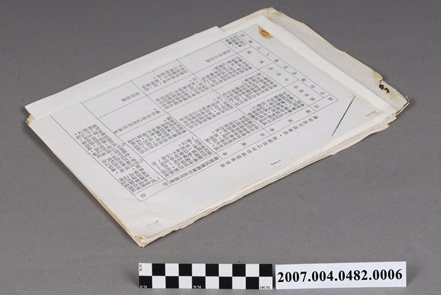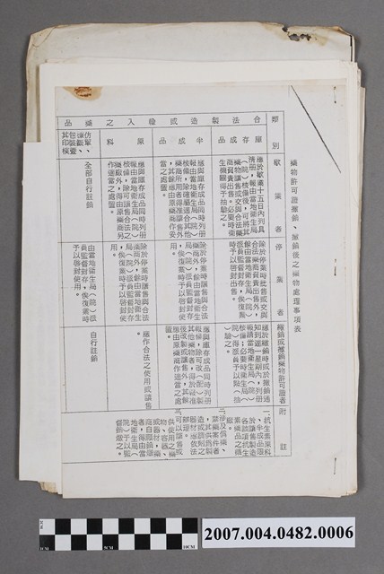 1. 本物件為藥物許可證撤銷、撤銷後之藥物處理事項表。本表針對合法製造或輸入之藥品及公司對象,列出藥物處理方式。藥物類別例有庫存成品,半成品,原料,仿單、標籤、包裝暨印模,對象例有歇業者、停業者、繳銷或撤銷藥物許可證者。另有文件有局長劉梅村之大印。 2. 此份文件與藥物許可證撤銷、撤銷有關,故其年代時間因與2007.004.0482.0005物件雷同。