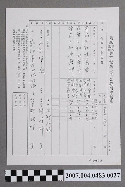 2007.004.0483.0027 藥物輸入製造許可證展延有效期間申請書008049號