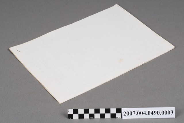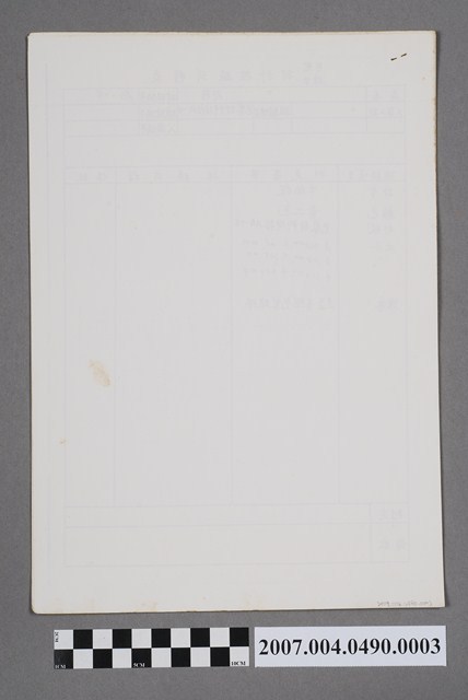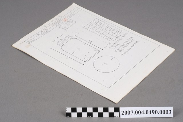 本物件為包裝材料規格3。規格表上有品名、制定者、制定日期、校對者、校對日期等欄位。品名為塑膠瓶,校對者欄位有一印章戳印。表格下方有空白處,畫有一個瓶子圖案,並寫有瓶子的顏色、容量、大小與材料等資料。瓶子為白色不透明。