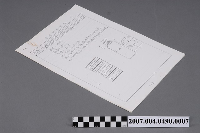 本物件為包裝材料規格7。規格表上有品名、制定者、制定日期、校對者、校對日期等欄位。品名為玻璃瓶(I),制定者欄位有沈碧瑩字樣,校對者欄位有一印章戳印,制定和校對時間分別為73.11.30、73.11.30。表格下方有空白處,畫有一個瓶子,並寫有瓶子的顏色、容量、大小與材料等資料。瓶子為棕色。