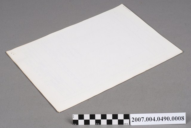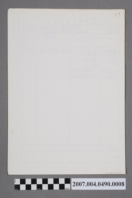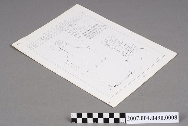 本物件為包裝材料規格8。規格表上有品名、制定者、制定日期、校對者、校對日期等欄位。品名為玻璃瓶,校對者欄位有一印章戳印,無制定和校對時間。表格下方有空白處,畫有一個瓶子,並寫有瓶子的顏色、容量、大小與材料等資料。瓶子為棕色。