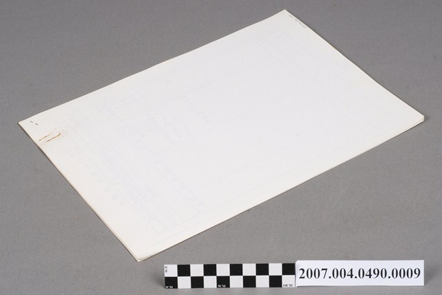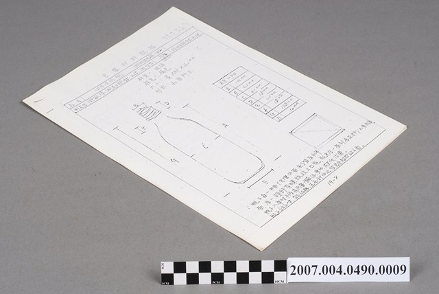 本物件為包裝材料規格9。規格表上有品名、制定者、制定日期、校對者、校對日期等欄位。品名為四角玻璃瓶,制定者欄位有許敏珠字樣,校對者欄位有一印章戳印,制定和校對時間分別為75.2.15、75.2.16。表格下方有空白處,畫有一個瓶子,並寫有瓶子的顏色、大小與材料等資料。瓶子為褐色。
