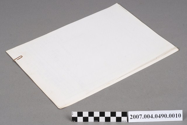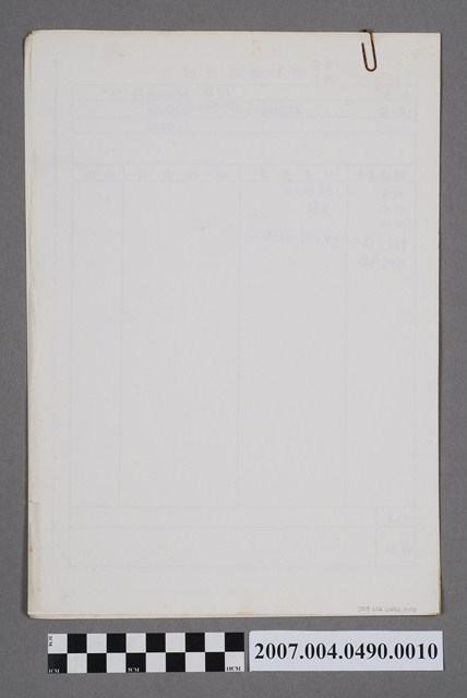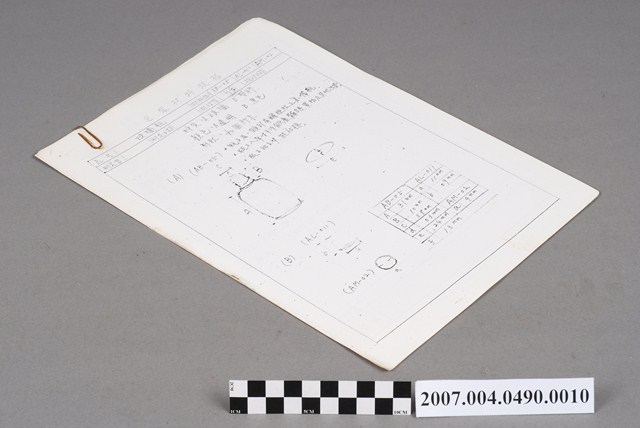 本物件為包裝材料規格10。規格表上有品名、制定者、制定日期、校對者、校對日期等欄位。品名為玻璃瓶,校對者欄位有一印章戳印,無制定和校對時間。表格下方有空白處,畫有瓶子圖案,並寫有瓶子的顏色、大小與材料等資料。瓶子為透明玻璃,蓋子為黑色塑膠。