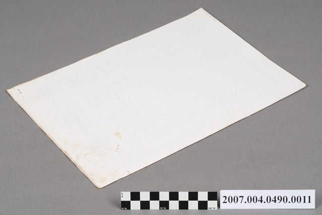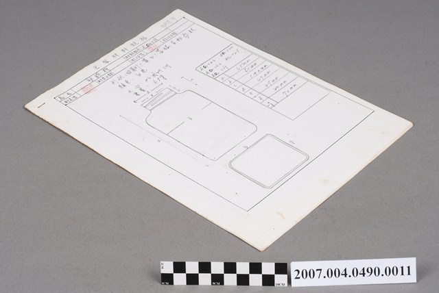 本物件為包裝材料規格11。規格表上有品名、制定者、制定日期、校對者、校對日期等欄位。品名為塑膠瓶,制定者和校對者欄位有印章戳印,無制定和校對時間。表格下方有空白處,畫有瓶子圖案,並寫有瓶子的顏色、大小、重量與材料等資料。瓶子為白色。