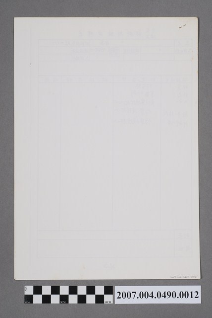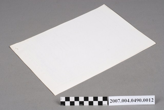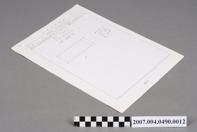 本物件為包裝材料規格12。規格表上有品名、制定者、制定日期、校對者、校對日期等欄位。品名為塑膠紙,制定者欄位有許敏珠字樣,校對者欄位有一印章戳印,制定和校對時間分別為74.11.1、74.11.2。表格下方有空白處,畫有一長方形,並寫有材質、形狀和顏色等資料,顏色為透明,印有青字。