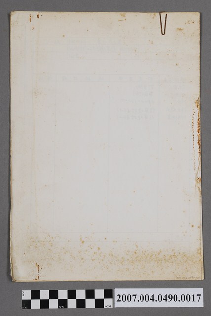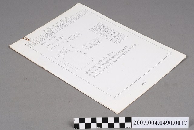 本物件為包裝材料規格17。規格表上有品名、制定者、制定日期、校對者、校對日期等欄位。品名為玻璃瓶,制定者欄位有許敏珠字樣,校對者欄位有一印章戳印,制定和校對時間皆為73.11.14。表格下方有空白處,畫有瓶子圖案,並寫有瓶子的顏色、 形狀、大小與材料等資料。瓶子為褐棕色。