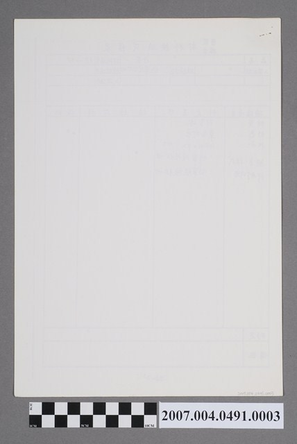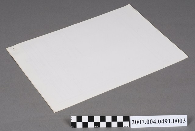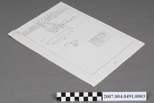 本物件為包裝材料規格3。規格表上有品名、制定者、制定日期、校對者、校對日期等欄位。品名為錫圓筒,制定者欄位有許敏珠字樣,校對者欄位有一印章戳印,制定和校對時間皆為74.7.29。表格下方有空白處,畫有圓筒圖案,並寫有其顏色、大小、形狀與材質等資料。