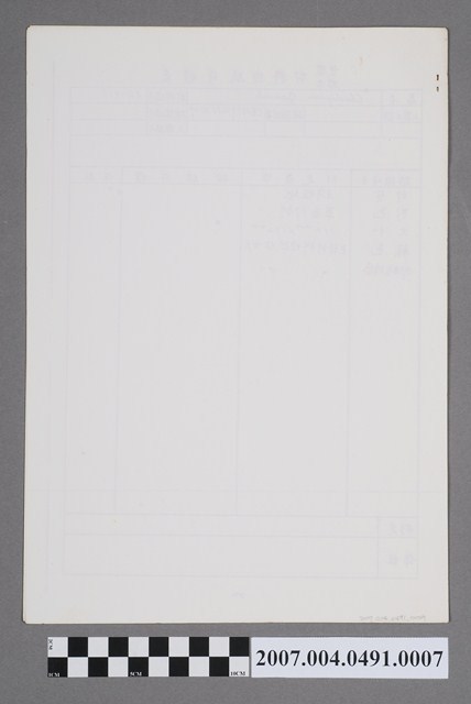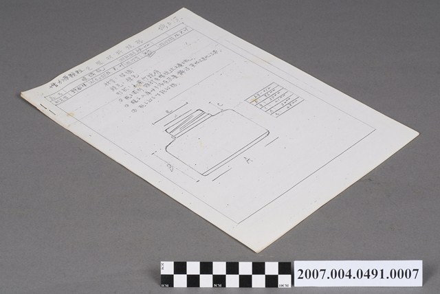 本物件為包裝材料規格7。規格表上有品名、制定者、制定日期、校對者、校對日期等欄位。品名為玻璃瓶,制定者欄位有許敏珠字樣,校對者欄位有一印章戳印,制定和校對時間皆為74.8.21。表格下方有空白處,畫有玻璃瓶圖案,並寫有其顏色、大小、形狀與材質等資料。玻璃瓶為棕色。