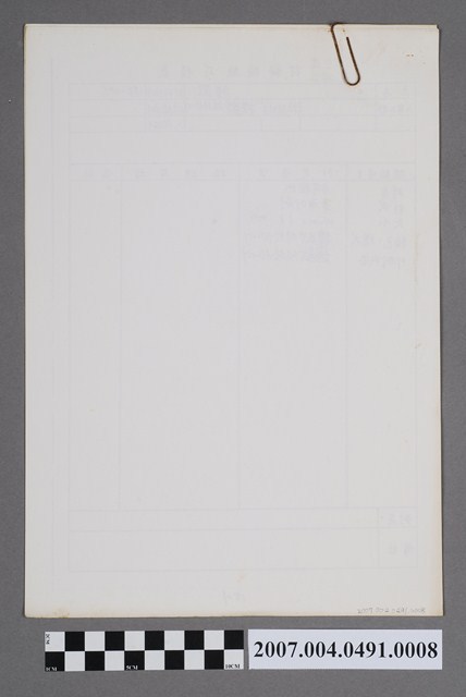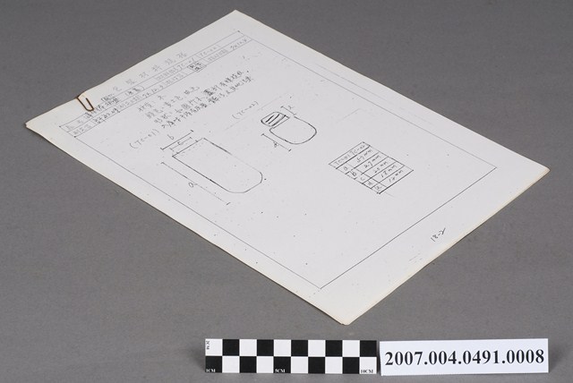 本物件為包裝材料規格8。規格表上有品名、制定者、制定日期、校對者、校對日期等欄位。品名為薄荷棒,制定者欄位有許敏珠字樣,校對者欄位有一印章戳印,制定和校對時間分別為74.12.3、74.12.4。表格下方有空白處,畫有兩個圖案,一為容器,二為上蓋,並寫有其顏色、大小、形狀與材質等資料。