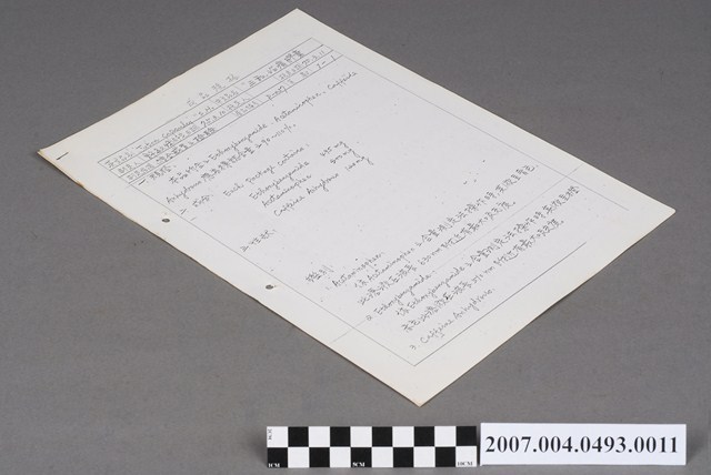 本物件為三和治痛膠囊成品規格。表格上有英文品名、中文品名、制定人、制定日期、核定人、核定日期、制定依據、產品編號和頁數欄位。制定人欄位為許敏珠,無核定人,制定日期和核定日期欄位分別為75.3.10、75.3.11,此應是民國紀年。制定依據為綜合感冒劑之檢驗。表格下方分為規格、成分、性狀、鑑別項目書寫。