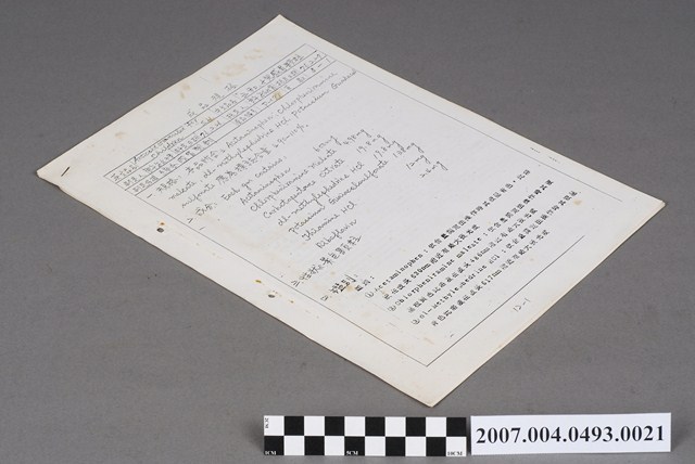 本物件為三和小兒感冒顆粒成品規格。表格上有英文品名、中文品名、制定人、制定日期、核定人、核定日期、制定依據、產品編號和頁數欄位。制定人欄位為許敏珠,核定人欄位為許敏娟,制定日期和核定日期欄位分別為76.2.26、76.2.27,此應是民國紀年。制定依據欄位為綜合感冒製劑。表格下方分為規格、成分、性狀、鑑別項目書寫。此藥性狀為黃色顆粒。