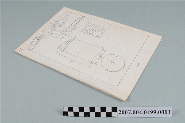 本物件為三和運功散包裝材料規格。表格上有品名、材料編號、制定者、制定日期、核對者、核對日期欄位。品名為塑膠瓶,制定者為許敏珠,校對者欄位有一印章戳印,制定和校對時間皆為75.10.1,此應為民國紀年。表格下方有空白處,畫有塑膠瓶圖案,並寫有其材質、顏色、形狀與長度等資料。塑膠瓶為白色。